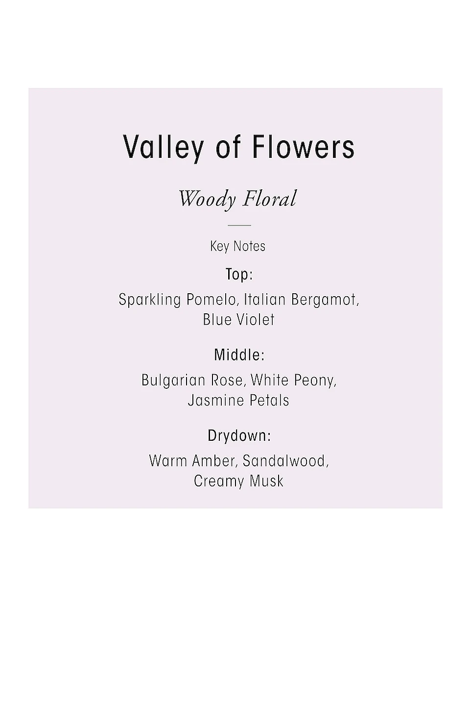 - Transform your atmosphere and wander into a vibrant field in full flower. Our scented candle opens with fresh notes of Bulgarian rose, jasmine petals and peony blossoms, which soften into a long-lasting trail of warm amber, textured woods and creamy musk. Lose yourself in the Valley of Flowers.